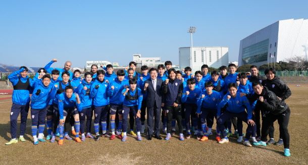 오영훈 지사는 7일 오후 제주시 애향운동장에서 전지훈련을 하는 K-리그 대표구단인 수원삼성블루윙즈 선수와 관계자들을 만나 환영 인사를 전했다.
