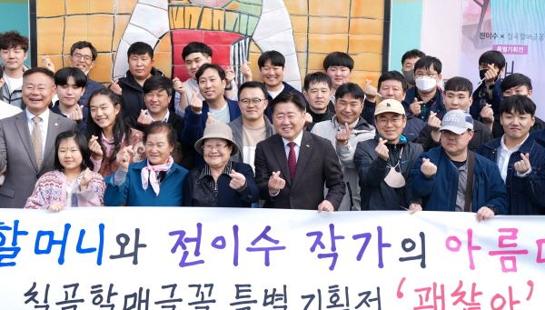 제주특별자치도는 16일 오후 제주시 조천읍 걸어가는 늑대들 갤러리에서 오영훈 제주도지사와 김재욱 경북 칠곡군수, 전이수 동화작가, ‘칠곡할매’(이원순, 김영분)를 비롯한 도민 및 관광객 100여명이 참석한 가운데 ‘전이수 작가·칠곡할매글꼴 특별기획전’이 열렸다고 밝혔다.