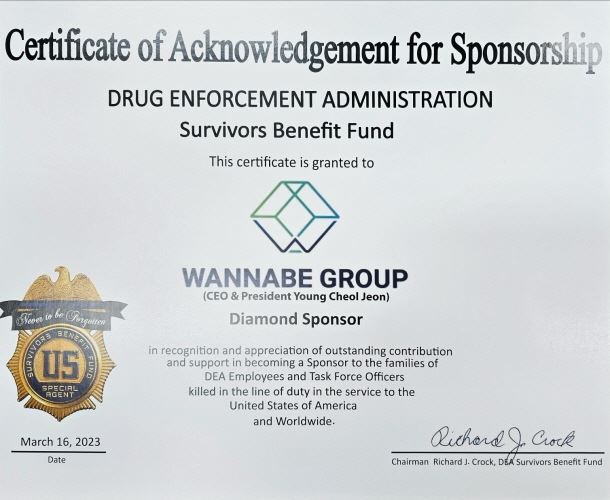 미국마약단속국(약칭 DEA) 생존자복지기금회에서 워너비그룹을 최고등급인 다이아몬드 스 폰서로 인증 하였다.