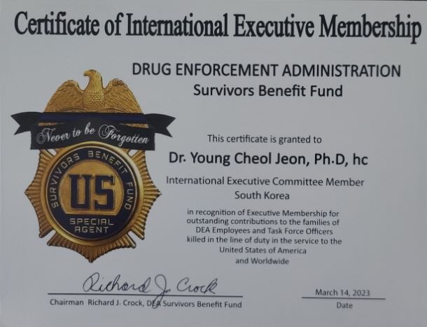 DEA 후원승인서란? 미국 및 전 세계에서 복무 및 활동을 하다 사망한 DEA직원과 테스크포스 장교 가족에 대한 후원자가 되는데 있어 탁월한 기여와 지원에 대한 인정과 감사의 표시로 단계별 브론즈, 실버, 골드와 최고등급인 다이아몬드 승인서를 발급하고 있다.