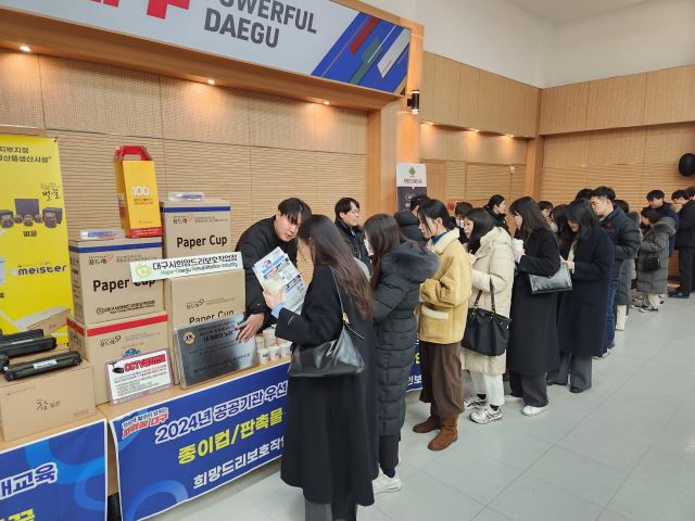 대구광역시는 보건복지부와 함께 중증장애인생산품 구매 독려를 위해 1월 25일(목) 대구시청 산격청사 대강당에서 공공기관 구매담당자를 대상으로 중증장애인생산품 우선구매 제도 교육을 실시하고, 중증장애인생산품 부스를 설치해 전시·홍보했다.
