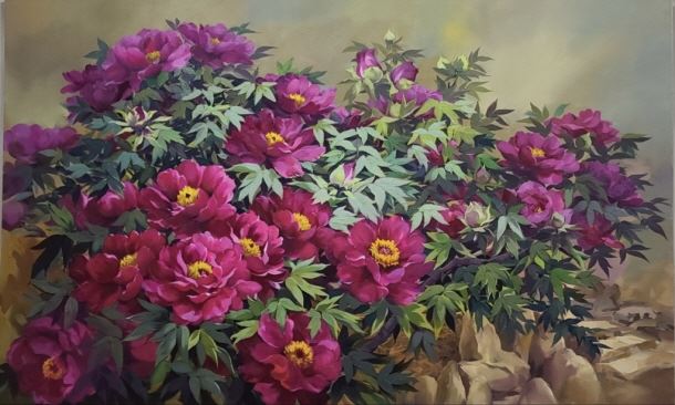 모란은 전통 문인화에서 많이 그려질 정도로 과거로부터 인기 있는 작품의 소재로 먹빛으로 만든 은은한 느낌의 한국화와는 다르게 유화의 특성을 살린 매끄러운 느낌의 모란은 현대적이며, 더욱 고급스러운 감성을 불어 넣었다. 푸르고 노란빛의 배경색은 핵심 주인공인 빨간 모란꽃을 더욱 부각시켜 감상자의 사선을 중앙으로 모이게 한다.