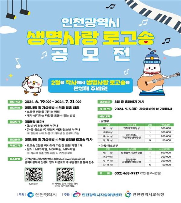 인천광역시는 자살예방 인식개선 및 생명존중 문화 조성을 위해 ‘2024년 인천시 생명사랑 로고송 공모전’을 실시한다.