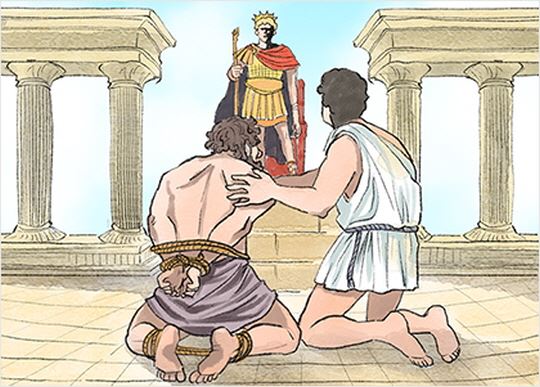 왕은 친구를 잘못 사귄 다몬이 어리석다고 생각하며 집행관에게 교수형 집행을 명령했습니다. 그런데 바로 그때 멀리서 피시아스가 고함을 치며 달려왔습니다.