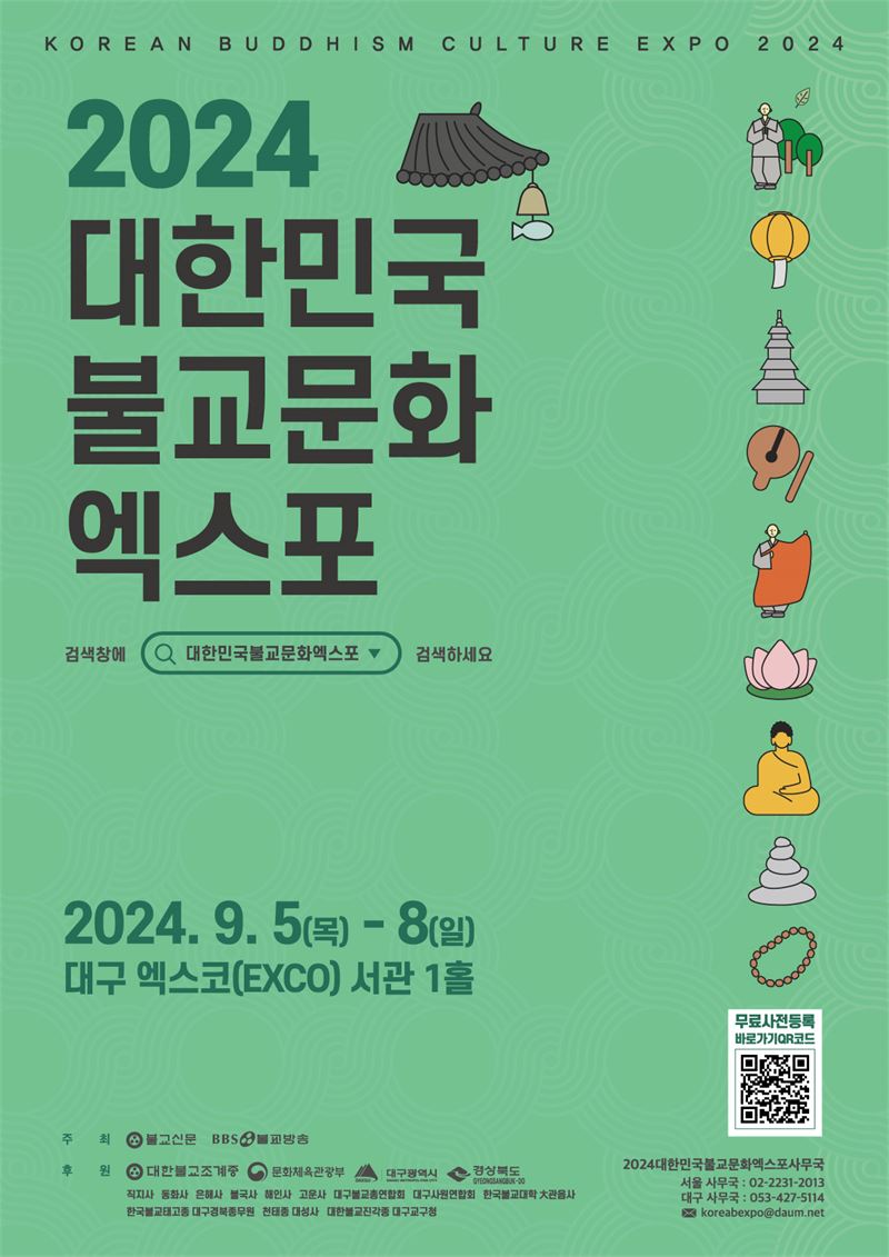 한편 ‘2024대한민국불교문화엑스포’에 대한 보다 자세한 사항은 공식 누리집(www.bexpodg.kr)과 ‘2024대한민국불교문화엑스포’ 서울사무국(02-2231-2013)과 대구사무국(053-427-5114) 유선문의를 통해 확인 가능하다.