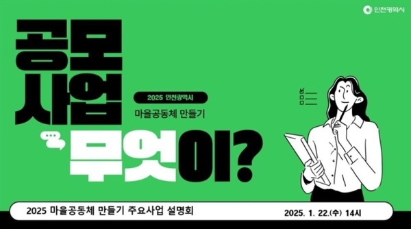 인천광역시는 1월 22일 제물포스마트타운 2층 대강의실에서 ‘2025년 인천광역시 마을공동체 만들기 주요사업 설명회’를 개최한다고 밝혔다.