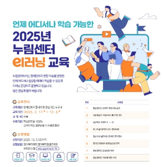 경기도장애인복지종합지원센터(이하 누림센터)는 다양한 장애인복지 현장의 소리를 반영해 교육 대상과 시·공간에 구애받지 않고 누구나 들을 수 있는 2025년 누림센터 이러닝 교육을 운영한다.