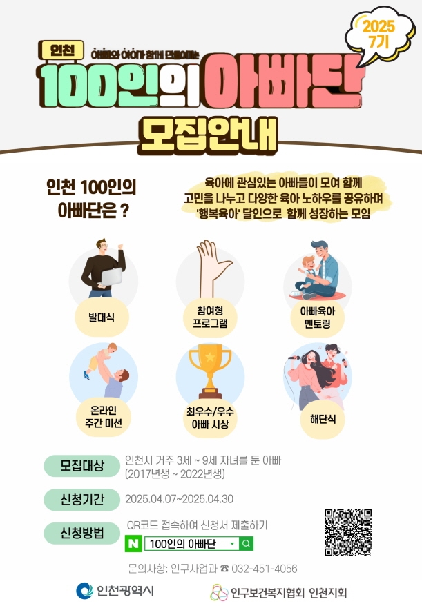 인천광역시는 인천시와 인구보건복지협회 인천지회가 공동으로 운영하는 ‘인천 100인의 아빠단’ 제7기를 모집한다고 밝혔다.